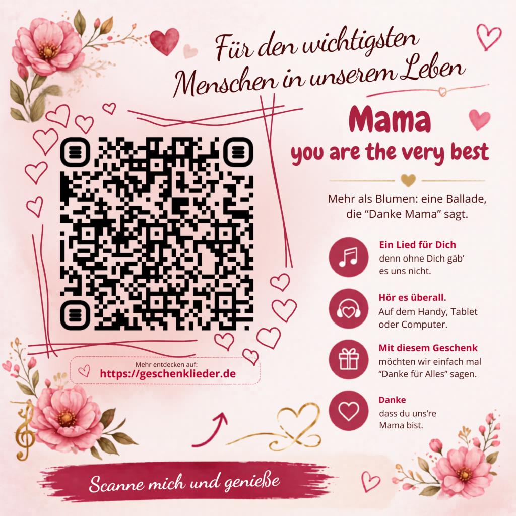 Du bekommst das Lied als Videodatei (MP4) und als PDF mit QR Code. Das Video oder die PDF kannst du deiner Mutter als Datei überreichen. Du kannst aber auch die PDF ausdrucken. Der QR Code führt deine Mutter dann zum Song.